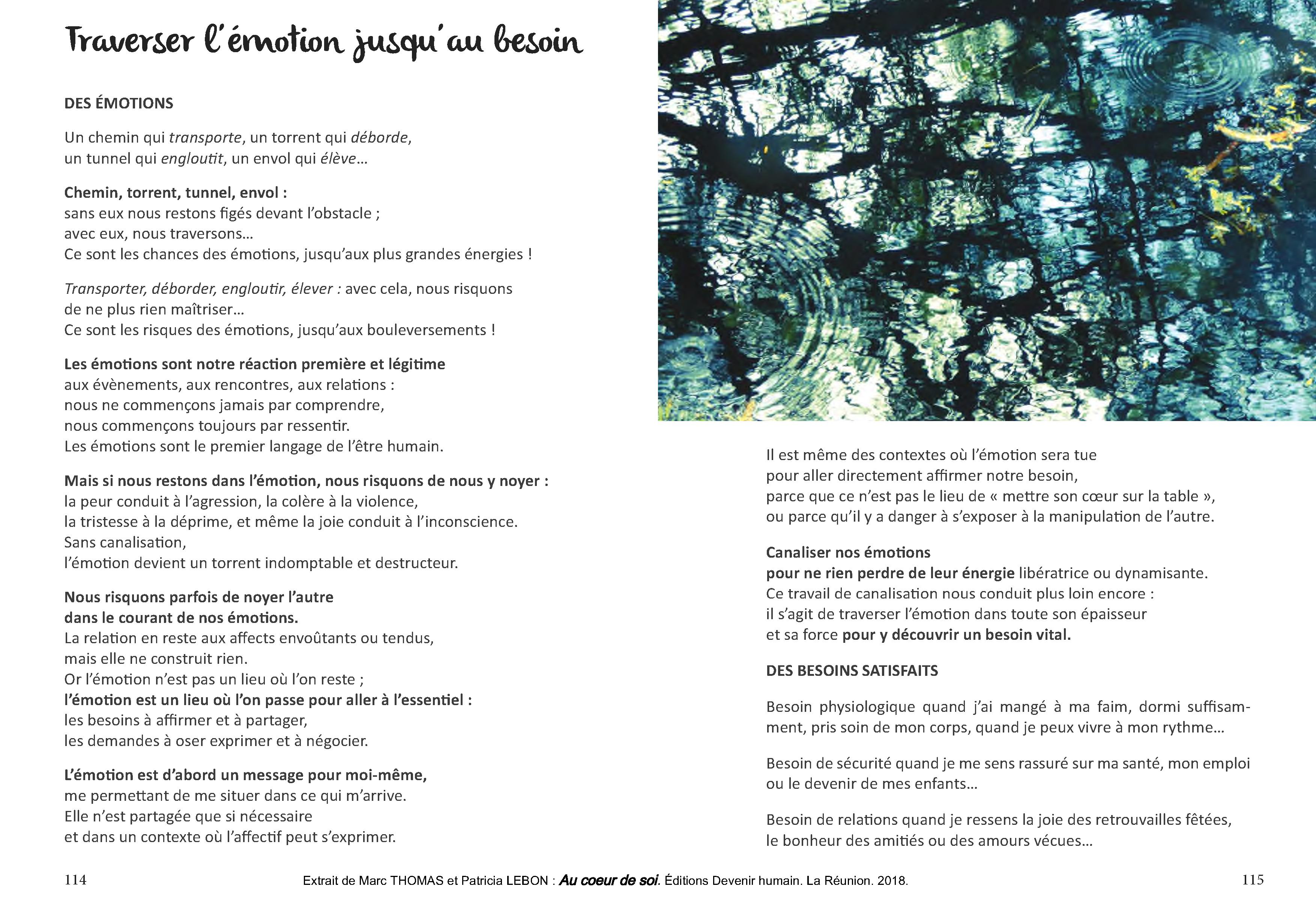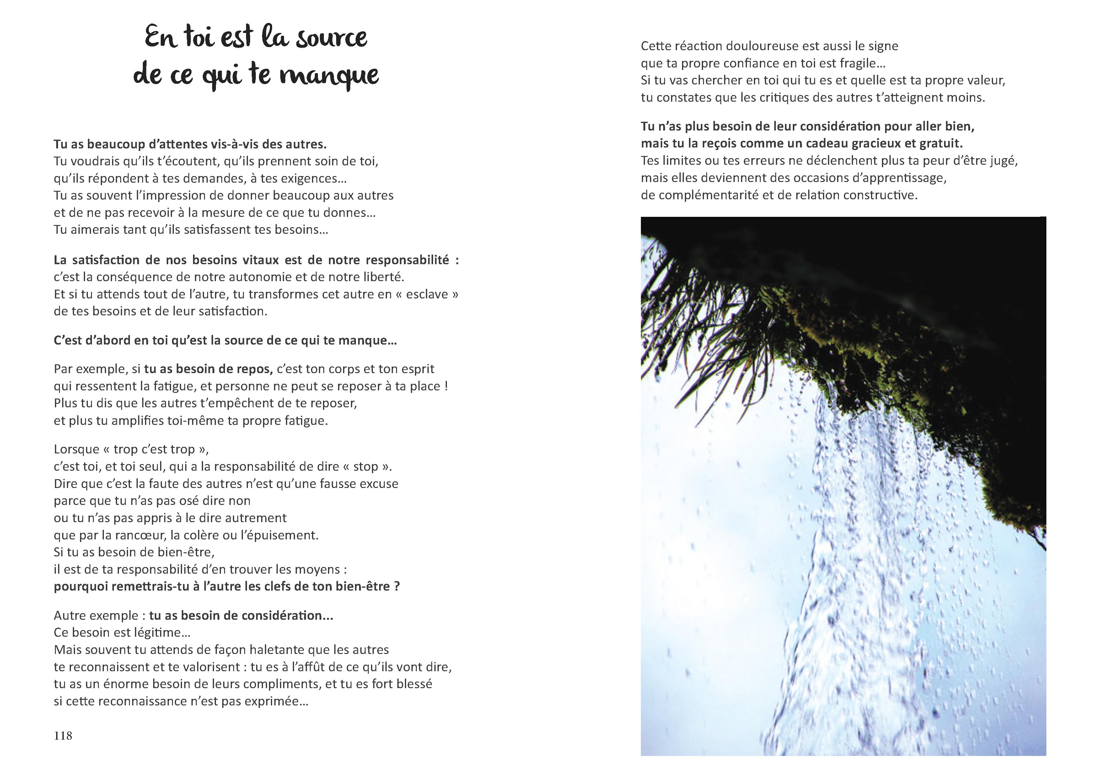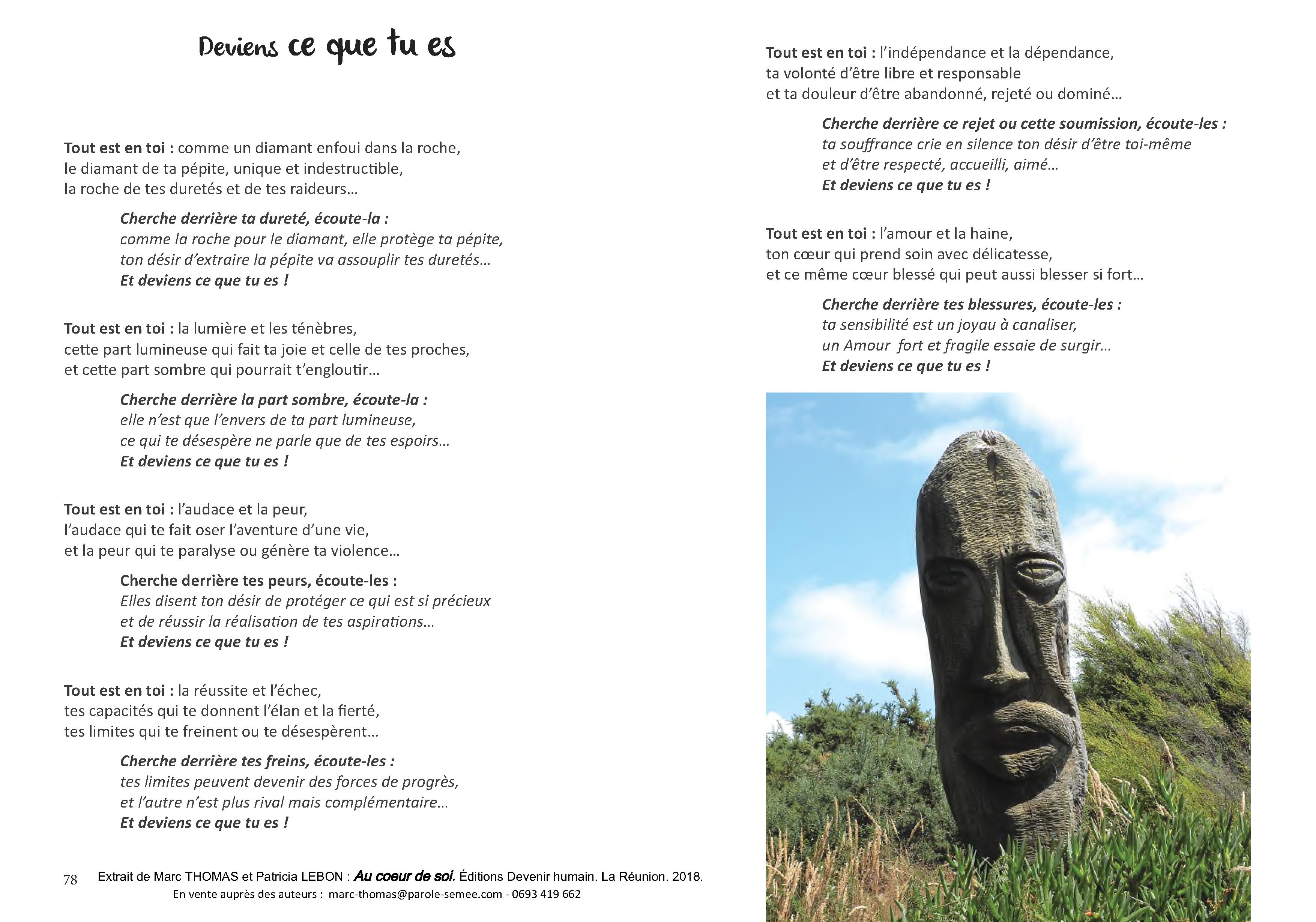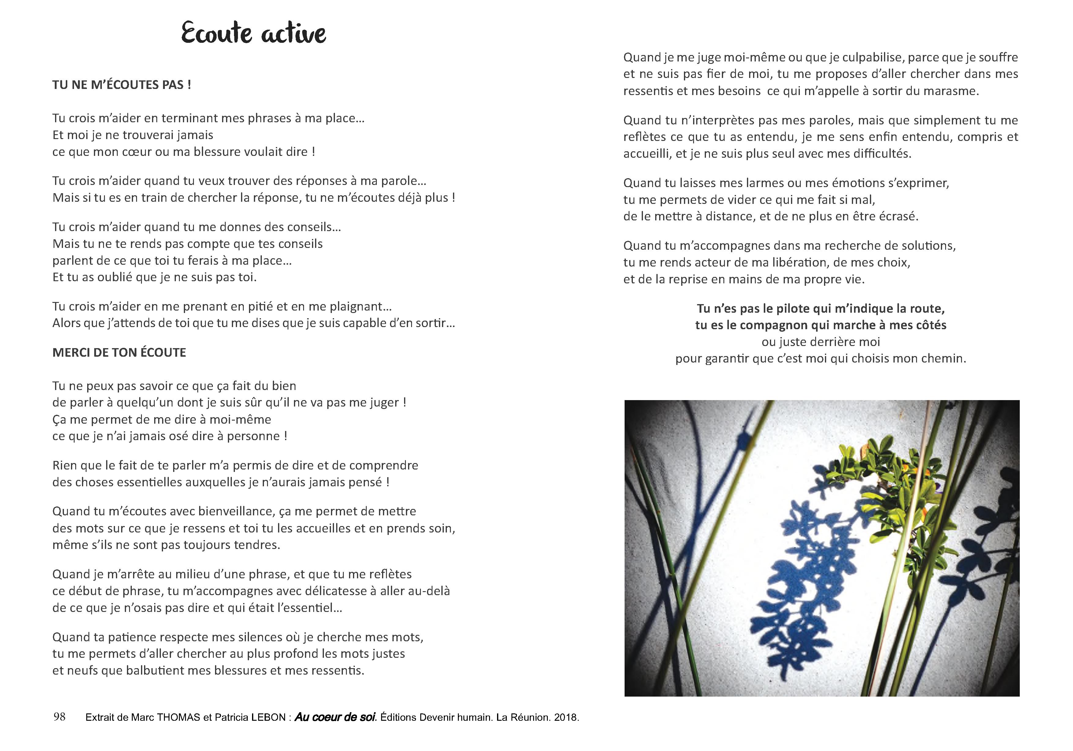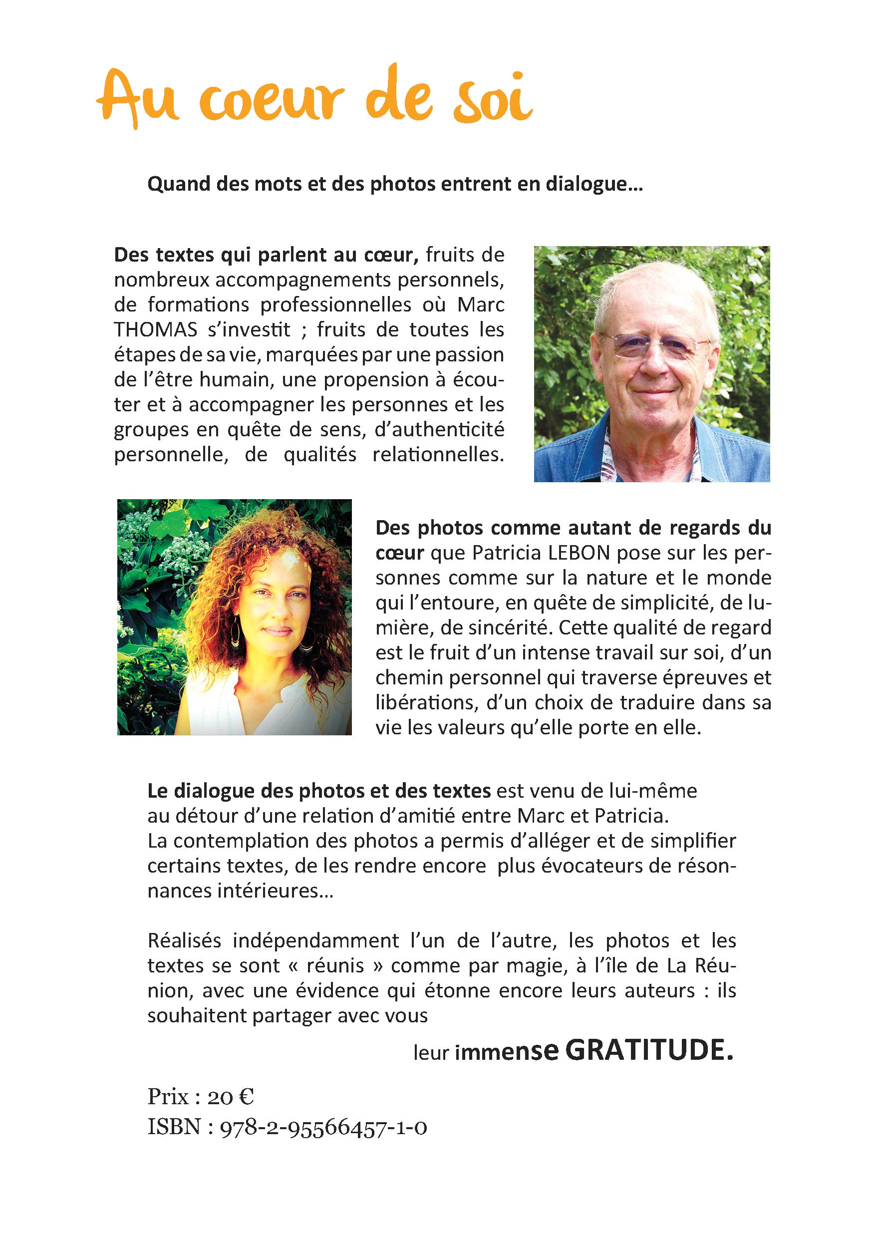 Ce livre est un dialogue entre les photos de Patricia et les textes de Marc. Deux modes d'expressions différents pour exprimer ce que je suis, ce qui me rend vivant et agissant au cœur de moi dans ma vie quotidienne. Ce livre ne se lit pas forcément du début à la fin. La Table des Matières nous permet de choisir l'article qui correspond à mon état du moment ou à ma recherche.